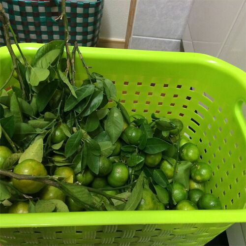 沖縄みかんとでも言いましょうか。通常のみかんより小さくて皮も若干硬いけど剥きやすいけど食べるとほぼ酸っぱくて種が多いシークァーサーを祖父母の畑に行ってたくさん狩ってきました。ビニール袋4袋分。それはそれは洗濯カゴに山程に。これを2日に分けて…
